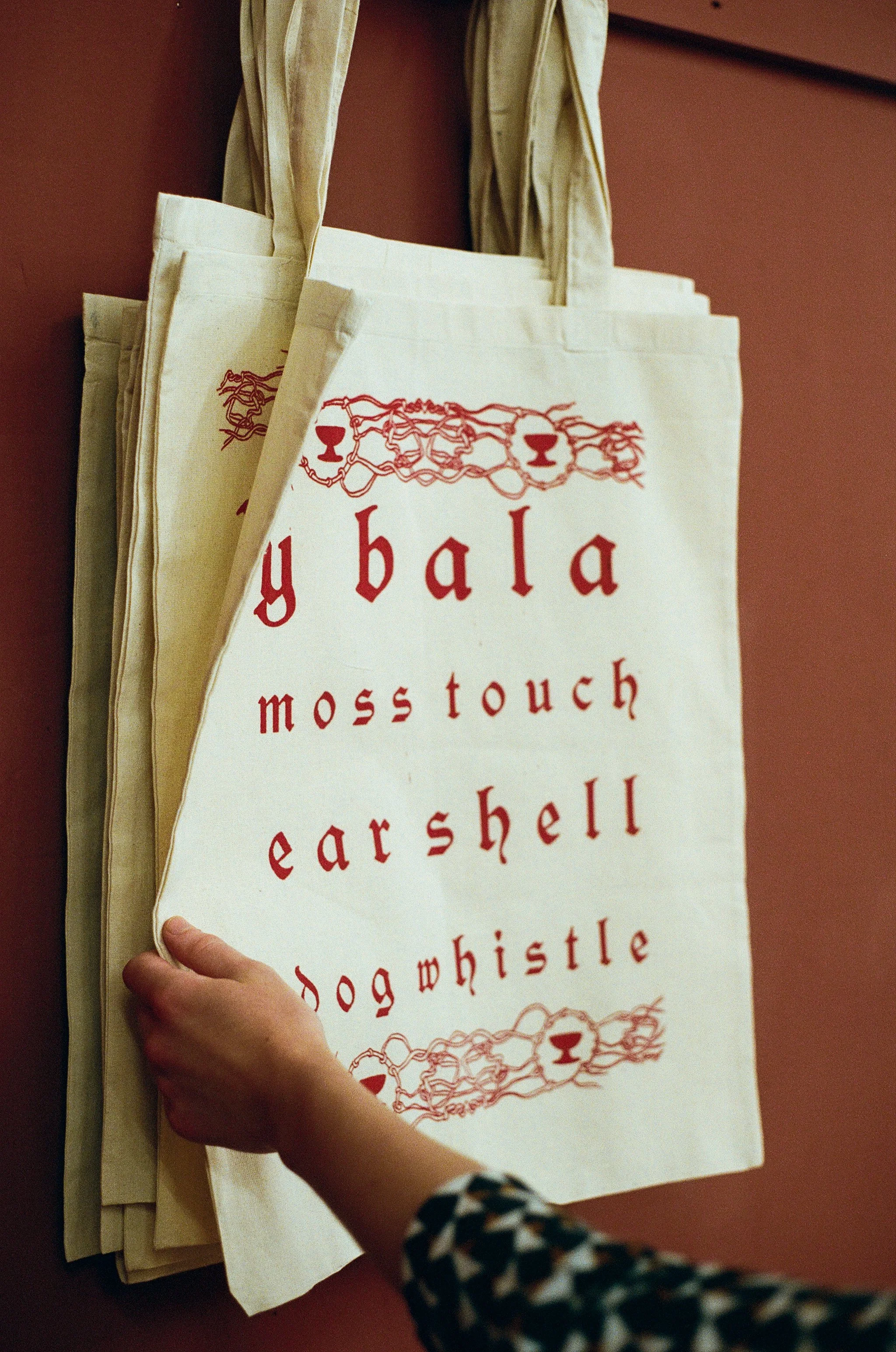 The design features a graphic representation of the entwinement of the material world and the spiritual world, woven via ‘the endless knot’ encircling an image of Lud’s Green Chapel in the centre. The separated letters of the words By-Flete and Lustrum are tethered via crossing threads that mimic the action demonstrated in the corresponding film work By-Flete. Each bag comes with its own ‘Gawain’s Girdle’ - a key motif in The Green Knight pertaining to protection and concealment.